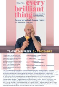 Filippo Nigro in “Every brilliant thing” al teatro RIFREDI da Segreteria | Nov 29, 2023 | Advanced I, Advanced II, Recitazione I, Recitazione II, Recitazione III, Recitazione Plus I, Recitazione Plus II, Recitazione Plus III, Videomaking I, Videomaking II, Videomaking III, Videomaking Plus I, Videomaking Plus II, Videomaking Plus III Biglietto per gli studenti FMA 12€ In segreteria verrà messa la solita lista per iscrivervi in modo da prenotare i posti tutti insieme.
